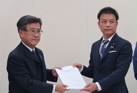 国民民主党の「スパイ防止法」制定に関する検討チームから中間報告を受け取る山田吉彦安全保障調査会長(左)=2日午後、国会内 国民民主党の「スパイ防止法」制定に関する検討チームは2日、中間報告をまとめた。外国政府の影響下で活動する個人・団体の登録制度を創設する「外国勢力活動透明化法」の制定などが柱。これを基に今月召集予定の臨時国会に法案を提出し、与野党の議論をリードしたい考えだ。