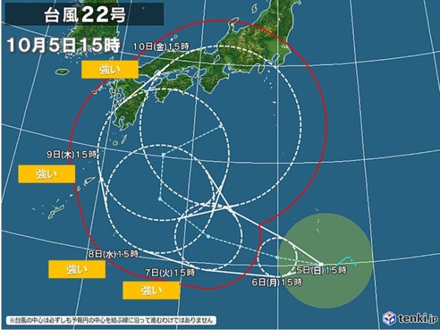5日(日)15時、台風22号は父島の南を西へ進んでいます。台風22号は今後も海面水温の高い海域を進むため、発達するでしょう。7日(火)は強い勢力に発達し、暴風域を伴う見込みです。7日(火)以降は次第に進路を北よりに変え、10日(金)には東よりに進路を変える見込みです。