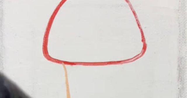今回の動画では、白いキャンバスに赤い傘の“キノコ”を描くところからメイキングがスタート。背景は黒、キノコの軸は薄いオレンジ色に塗りつぶし、青い点2つの“目”と赤い線だけの“口”を軸の部分に追加します。これだけでは、ただ雑な塗り方でざっと描いただけのコミカルなキノコの絵に見えますが……。