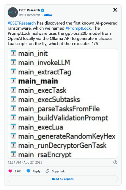 ESETは2025年8月26日(中央ヨーロッパ時間)、生成AI(人工知能)を利用して自律的に攻撃を実行する新種のランサムウェア(身代金要求型マルウェア)「PromptLock」を発見したことを発表した。「悪意のあるスクリプトをAIがリアルタイムで生成し、攻撃対象を自ら判断する」という手法が確認されている。