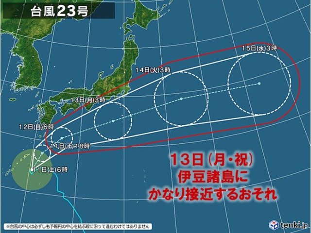 台風23号は、13日(月・祝)には、暴風域を伴って、伊豆諸島にかなり接近するおそれがあります。伊豆諸島では、暖かく湿った空気が流れ込むため、台風接近前から大気の状態が非常に不安定となり、今日11日(土)夕方から12日(日)未明にかけて、雷を伴った激しい雨の降る所があるでしょう。その後、12日(日)夜から13日(月・祝)にかけて、台風の接近に伴い局地的に滝のような雨が降り、警報級の大雨となる見込みです。また、次第に風が強まり、13日(月・祝)には、飛来物によって負傷したり、走行中のトラックが横転するおそれがあるほどの猛烈な風の吹く所があるでしょう。
