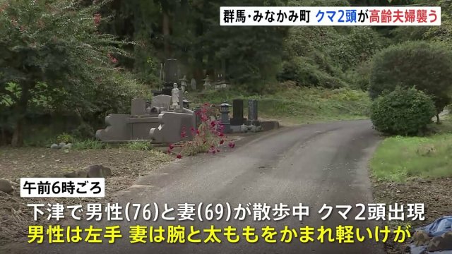 警察などによりますと、午前6時ごろ、みなかみ町下津で76歳の男性と69歳の妻が散歩をしていたところ、クマ2頭が現れ、男性は左手を、妻は腕と太ももをかまれ、軽いけがをしました。