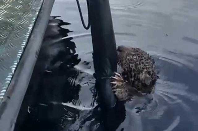 環境警察と野生生物の専門家たちは即席の浮き具を用意し、ボートでジャガーに接近。すると、ジャガーはすぐに浮き具にしがみつきました。