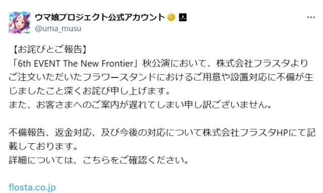 この問題に『ウマ娘』公式は「【お詫びとご報告】「6th EVENT The New Frontier」秋公演において、株式会社フラスタよりご注文いただいたフラワースタンドにおけるご用意や設置対応に不備が生じましたこと深くお詫び申し上げます。また、お客さまへのご案内が遅れてしまい申し訳ございません」と謝罪。