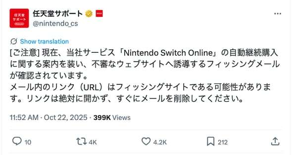 任天堂は10月22日、オンラインサービス「Nintendo Switch Online」の自動継続購入に関する案内を装い、不審なWebサイトへ誘導するフィッシングメールを確認したとして注意喚起した。
