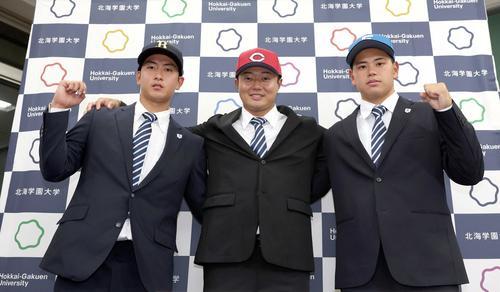 北海学園大が、北海道内のチームからは史上初となる同時3人の指名を受けた。支配下は2人。最速159キロ右腕の工藤泰己投手(4年=北海)は広島4位、高谷舟投手(4年=札幌日大)はオリックス5位。常谷拓輝内野手(4年=札幌静修)は日本ハムから育成1位だった。全員で並んで一緒にドラフト会議を見守った。工藤は「まさかカープとは思っていなかったので、びっくりした気持ちはあるけど、シンプルにうれしい気持ち」と語った。