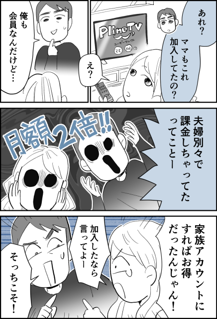 知らない間に夫婦別々に同じサブスク動画配信サービスへ加入していたのです。課金額2ばーい! 家族アカウントにすればお得だったのに、なんてもったいないことを……。これ、結構あるあるみたいですね。夫もですが、お子さんやほかのご家族にも確認したほうがいいですよ。