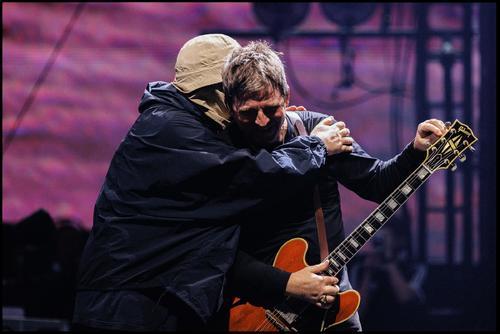 度重なる兄弟げんかの末、09年に解散。16年間疎遠だったノエル・ギャラガー、リアム・ギャラガー兄弟がつないだ手を高く掲げて登場した。ステージで熱くハグを交わす光景に、40〜50代のオアシス世代を中心とする超満員5万人のファンから大歓声が起こった。