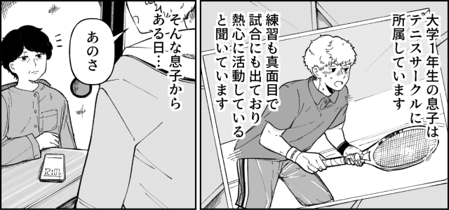 私は50代のアスカ。息子のタイチは大学1年生で日々キャンパスライフを楽しんでいます。高校でテニス部だった息子は、大学でも好きなテニスを続けたくて学内のサークルに入りました。伝統あるサークルで実力者も多く、大会に出るなど熱心に活動しているそうです。息子とはあらかじめ話し合い、サークルにかかるお金はバイト代から出してもらうことになっています。そんなある日、息子がサークル仲間のユウジくんについて相談してきました。
