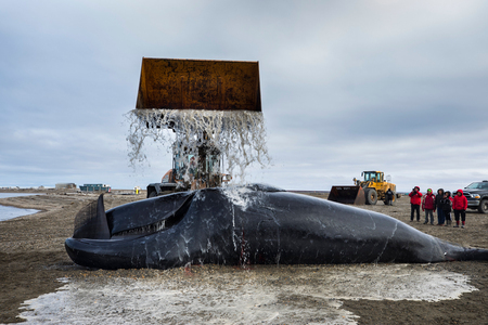 捕獲されたホッキョククジラ=2017年9月、米アラスカ州カクトビック(EPA時事)