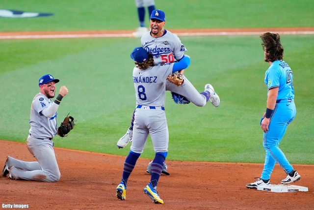 9回裏、併殺で試合終了となり喜びを爆発させるドジャースの選手たちワールドシリーズ第6戦