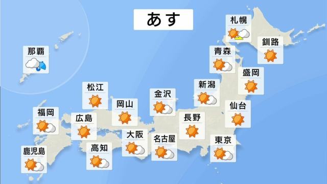 あすは、上空に寒気が流れ込む予想で、朝はヒンヤリしそうですが、日中は日差しがよく届き、北日本の日本海側の地域を中心に気温が上がる予想です。朝晩と日中の寒暖差が大きくなりますので、服装でうまく調整するようにしましょう。
