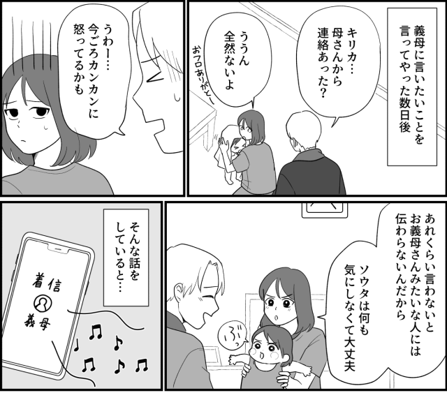 「あれから、母さんから連絡あった? きっと怒ってるよ……」と、心配するソウタ。義母みたいな人にははっきり言わないとわからないのだからあれくらい言って当然です。そんな話をしていると、またもや義母から着信が。私はソウタに目くばせをしてから、電話に出ました。