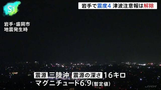 きのう午後5時3分ごろ、岩手県で震度4を観測するやや強い地震がありました。震源は三陸沖、震源の深さは16キロ、マグニチュードは暫定値で6.9となっています。