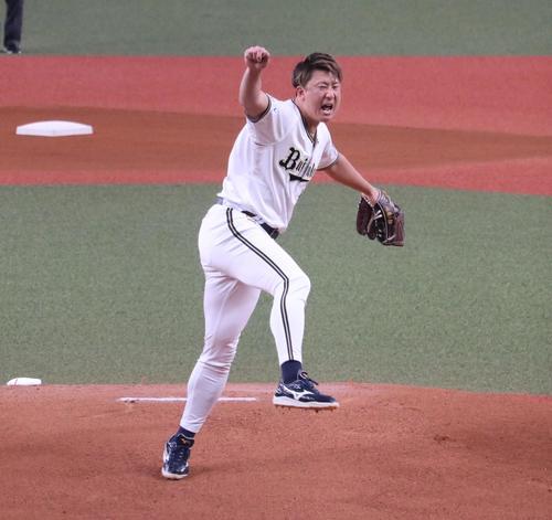身長190センチの巨体からワインドアップで豪快投球。「あー」と雄たけびをあげ、高めにストライクを投げ込むと、昇天ポーズを決めた。自己採点は「120点!」とにっこりだ。