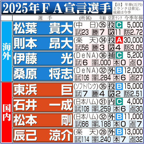国内外への移籍が可能となる海外FAは4人。楽天則本昂大投手(34)は日米42球団を選択肢としている。DeNA伊藤光捕手(36)桑原将志外野手(32)中日松葉貴大投手(35)も行使した。国内FAも4人。日本ハム石井一成内野手(31)は西武が、松本剛外野手(32)は巨人が、それぞれ調査を進める。楽天辰己涼介外野手(28)はポスティングシステムによるメジャー挑戦を目指していたが球団から容認されず、権利行使に踏み切った。ソフトバンク東浜巨投手(35)も行使。宣言選手は今日13日から、他球団との交渉が可能となる。