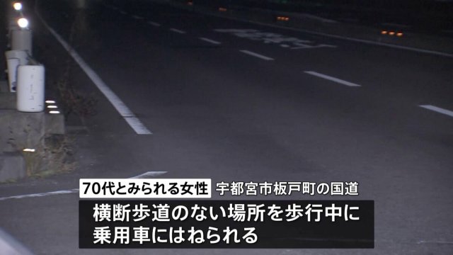 警察によりますと、きのう午後4時前、宇都宮市板戸町の国道で、70代とみられる女性が横断歩道のない場所を歩いて渡っていたところ、普通乗用車にはねられたということです。
