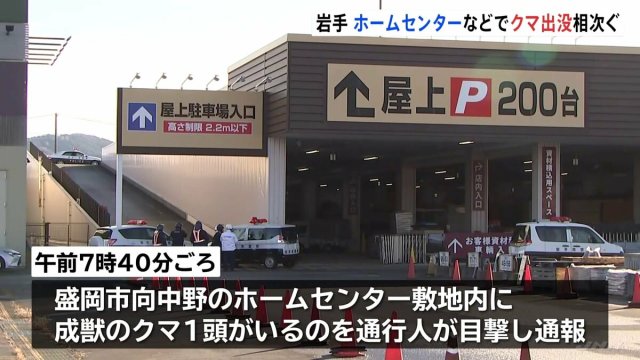 警察や市によりますと、きょう午前7時40分ごろ、盛岡市向中野のホームセンターの敷地内に、成獣のクマ1頭がいるのを通行人が目撃して警察に通報しました。クマはその後、立体駐車場に移動したため、店のスタッフと警察が出入り口を封鎖して閉じ込めました。