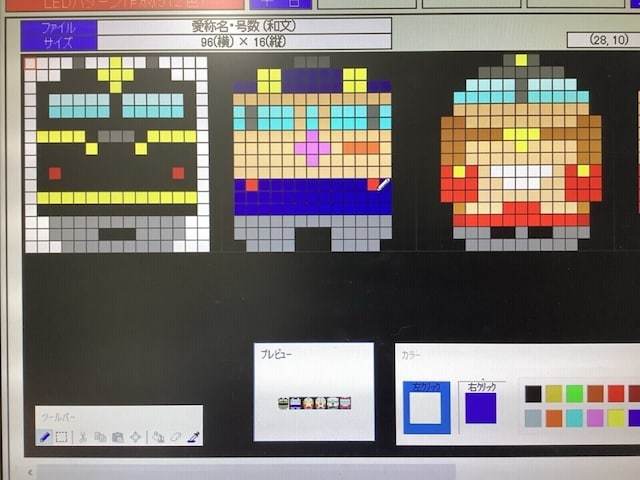列車アイコン1つを作るのにかかる時間は、今はだいぶ慣れたので20分くらい。パソコンのソフトを使って、ドット打ちしています。色が512色から選べるので、列車の写真を参考にしながら近い色を再現しています。
