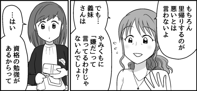 私は義実家に「本当の娘」のように扱ってもらいたいだけ。義実家が「本当の家族」として里帰りを受け入れてくれること、それが私の願いなんです。だからこそ、ナナコさんの資格勉強よりも、私のお腹に宿る新しい命を優先してほしい。命に代わるものやサービスなんて、存在しません。