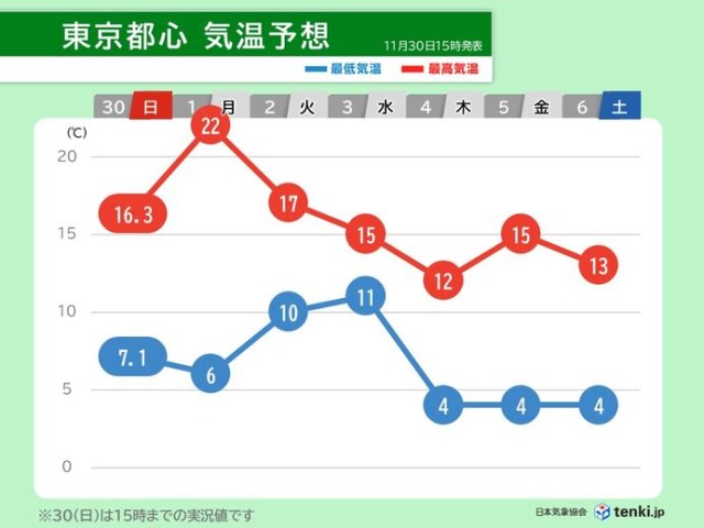 明日から12月。関東は気温の変動が激しい冬のスタートとなりそうです。