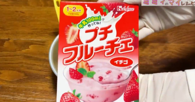 シフォンケーキ作りで水分を多く入れると大変なことになるとのことで、牛乳などの他の水分は入れずに、フルーチェのみで作ることに。また、内容量が100グラムと少なめの「プチ フルーチェ イチゴ」をダイソーで購入して使っています。