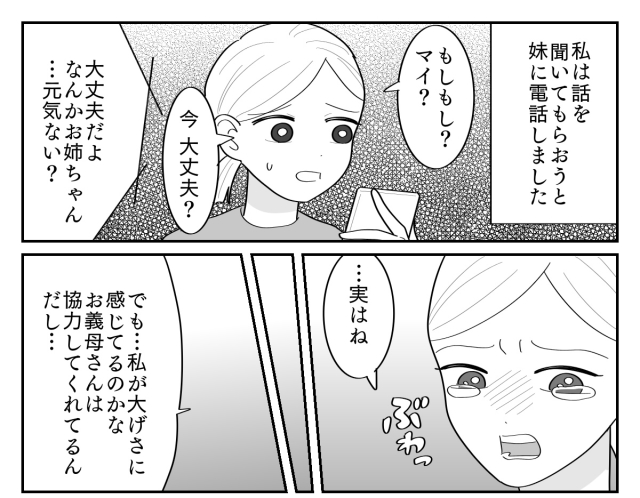 マイの優しい声を聞くなり、泣き出してしまった私。自分でも、そこまで追い詰められていたんだなと、あらためて実感しました。義母の態度や私への口出し、夫に相談しても我慢しろと言われたこと……。話しているうち「離婚」の言葉も口から出ました。