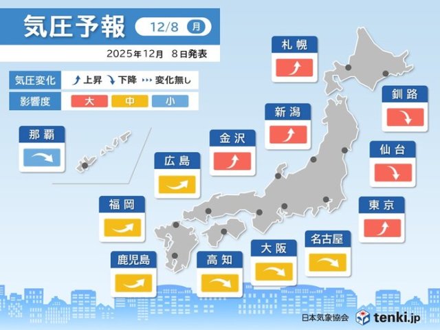 週明けの今日8日は気圧の変動が大きく、特に東日本から北日本で影響度が「大」のところが多くなっています。気圧の変化に伴う、めまいや頭痛、関節痛などに注意が必要です。