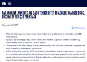 Paramount「PARAMOUNT LAUNCHES All-CASH TENDER OFFER TO ACQUIRE WARNER BROS. DISCOVERY FOR $30 PER SHARE」(December 8, 2025)