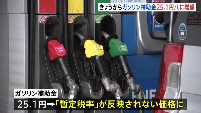 政府はきょうからガソリンの補助金を1リットルあたり5円ほど引き上げ、25.1円となり、暫定税率が廃止された場合と同じ水準になります。