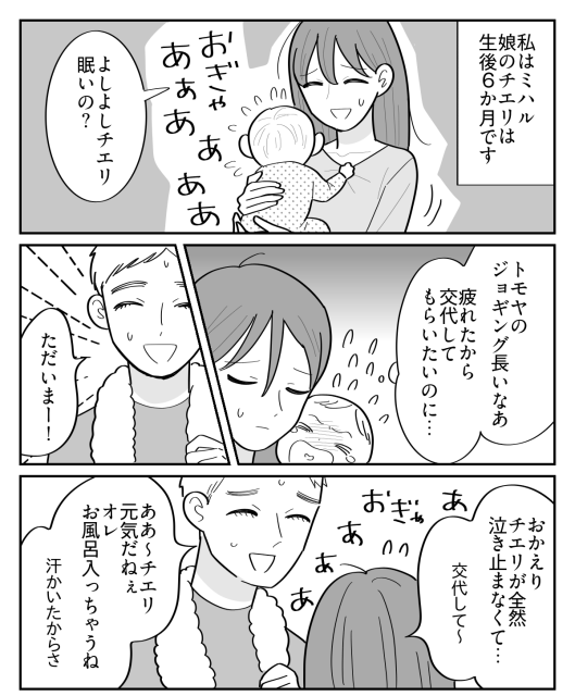 お風呂場にまでチエリの大きな泣き声が響いてきて、私は急いで泡を洗い流すとバスタオル1枚を巻いただけで飛び出しました。すると目に入ったのは、泣いているチエリを床に転がしたままストレッチをしているトモヤでした。