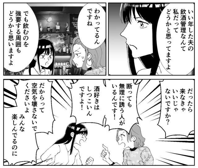 言い合っていた私たちのあいだに、知らない初老女性が割って入ってきました。女性は「いい大人なのに飲み方が幼稚」と、奥さんの肩をもつようなことを言っています。急に来て何……? と私たちが疑問に思っていると……。