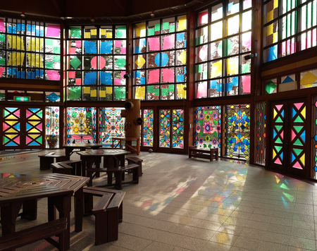 ステンドグラス風にカラーセロハンで装飾された「このはな館」のガラス窓=19日午後、愛知県東浦町 愛知県東浦町役場近くの公園で、休憩所などとして利用される「このはな館」のガラス窓が、ステンドグラス風にカラーセロハンで装飾されている。床から天井までの高さは約6.6メートルで、晴れた日には窓から光が差し込み、床面にカラーセロハンの色が映るという。
