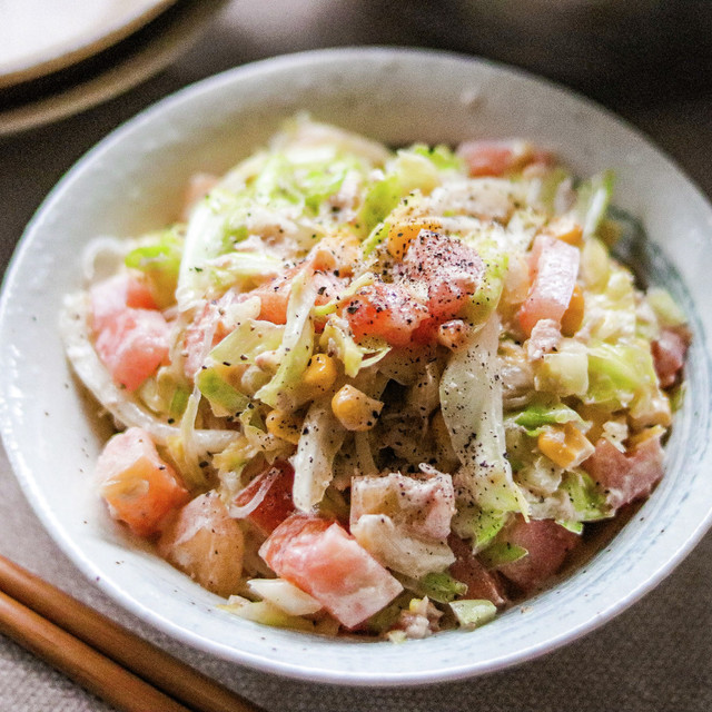 材料は春雨、コーン、ツナ、キャベツなど。キャベツは塩もみして水分を絞ることで、たっぷり食べられます。春雨は表示時間どおりにゆでます。気になる味つけは、マヨネーズ、ポン酢、にんにくなど。これらを混ぜてたれを作り、具材をあえれば出来上がり。