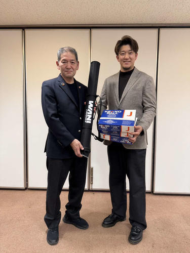 野球用品等を寄贈した阪神岩貞(右)(阪神タイガース提供)