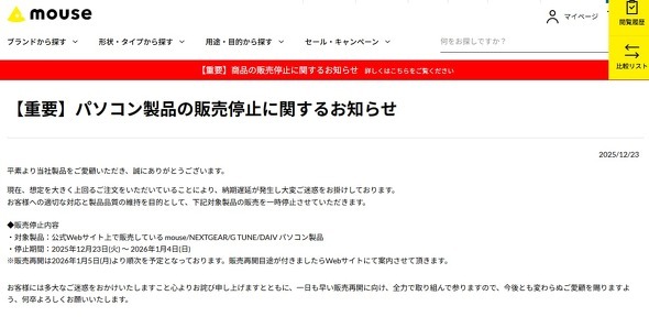 また、国内ではマウスコンピューターが2026年1月以降の価格改定を順次実施すると発表し、一部PC製品のWeb販売を一時停止する異例の措置を取っています。