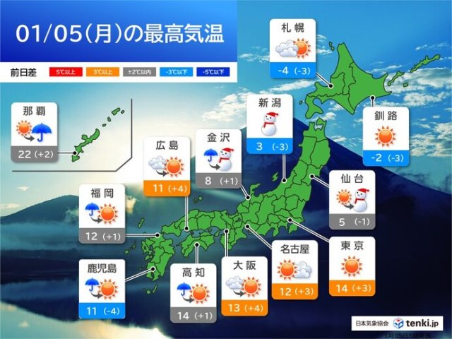 最高気温は、北海道や東北では昨日4日より低い所がほとんどで、真冬並みの寒さになるでしょう。札幌は午前5時の気温がマイナス6.3度。最高気温はマイナス4度と、朝からほとんど上がらない予想です。日差しが届く太平洋側でも、冷たい季節風の影響で、気温よりも寒く感じられるでしょう。北陸は昨日4日より高い所がありますが、日中はあまり上がりません。夜は寒気が流れ込むため、朝よりも寒くなりそうです。