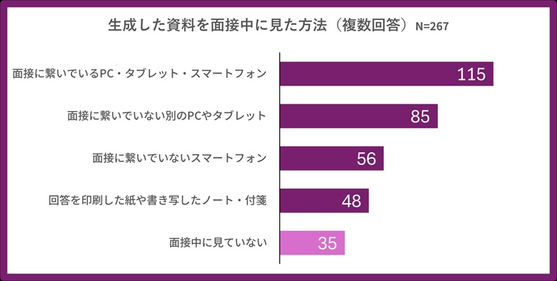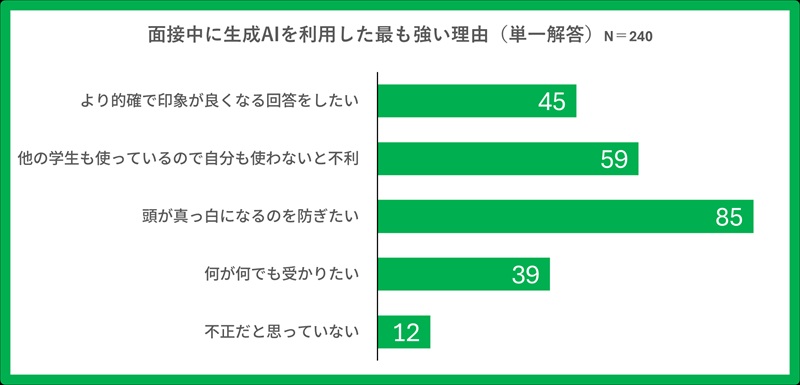 そして、面接準備で生成AIを利用した267人のうち86%が事前に生成した資料を実際の面接中に参照していた。さらに、面接官の質問内容を生成AIに直接音声認識させ、リアルタイムに回答例を生成していた学生は全体の5人に1人(22%)に上ったという。Web面接中にリアルタイムで生成AIから回答支援を受けていた学生は全体の45%におよんだ。面接中の生成AIを活用する理由としては、「頭が真っ白になることを防ぐため」(35%)が最も多く「他の学生も使っているので、自分も使わないと不利になるため」(24%)が続いた。