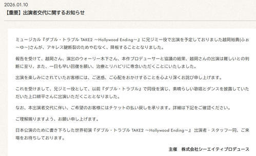 ミュージカル「ダブル・トラブルTAKE2〜Hollywood Ending〜」の公式X(旧ツイッター)がこの日、更新され、「重要/必ずご確認ください」とのタイトルで、同ミュージカルについて「出演者交代に関するお知らせ」を伝えた。