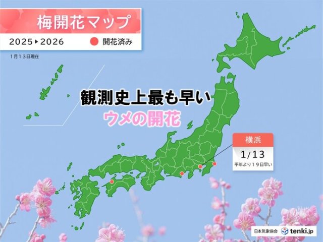 今日13日、横浜でウメが開花しました。平年よりも19日早く、また昨年より18日も早い開花となっています。関東では1月11日の銚子(千葉)に次ぐ、2番目の開花です。