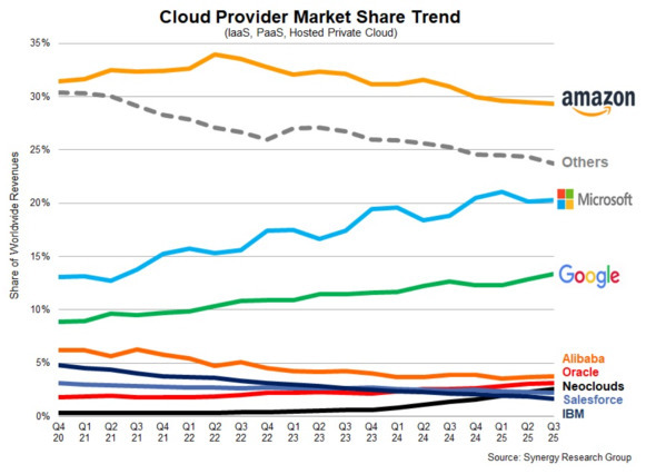 ¡¡Ä´ºº²ñ¼ÒSynergy Research Group¤ÏÀ¤³¦¤Î¥¯¥é¥¦¥É¥¤¥ó¥Õ¥é¥µ¡¼¥Ó¥¹»Ô¾ì¤Ë´Ø¤¹¤ë2025ǯÂè3»ÍȾ´ü¡Ê2025ǯ7¡Á9·î¡Ë¤Î¥Ç¡¼¥¿¤ò¸øÉ½¤·¤¿¡£Âè3»ÍȾ´ü¤Î»Ô¾ìµ¬ÌϡʡÖIaaS¡×¡ÒInfrastructure as a Service¡Ó¡¢¡ÖPaaS¡×¡ÒPlatform as a Service¡Ó¡¢¥Û¥¹¥Æ¥Ã¥É¥×¥é¥¤¥Ù¡¼¥È¥¯¥é¥¦¥É¤ò´Þ¤à¡Ë¤Ï1070²¯¥É¥ë¡ÊÌó16Ãû7990²¯±ß¡ã1¥É¥ë=Ìó157±ß¤Î°ÙÂØ¥ì¡¼¥È¤Ç´¹»»¡¢°Ê²¼Æ±¡ä¡Ë¤È¤Ê¤Ã¤¿¡£¤³¤ì¤Ï8»ÍȾ´üÁ°¡Ê2ǯÁ°¡Ë¤Î680²¯¥É¥ë¤«¤éÂçÉý¤Ê³ÈÂç¤Ç¤¢¤ê¡¢²áµî12¥«·î¤ÎÎß·×Çä¾å¹â¤Ï3900²¯¥É¥ë¡ÊÌó61Ãû2300²¯±ß¡Ë¤Ë㤷¤¿¡£