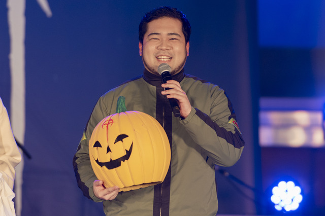 さらにイベント中盤には突如として、会場内のビジョンに“かぼちゃ頭”のマスクを被った人物が出現した。場内が騒然となる中、主人公ハサウェイ・ノアがリーダーを務める反地球連邦政府運動「マフティー」を名乗り、そのまま張り詰めた空気の中ステージへ登場する。やがてかぼちゃの被り物を脱ぐと、公式SNSなどを通じて街中に出没し話題を集めていた“謎のかぼちゃ頭のボス”の正体が、M-1王者のお笑いコンビ・令和ロマンの松井ケムリであることが判明する。意外すぎる正体に、会場は笑いと拍手に包まれた。