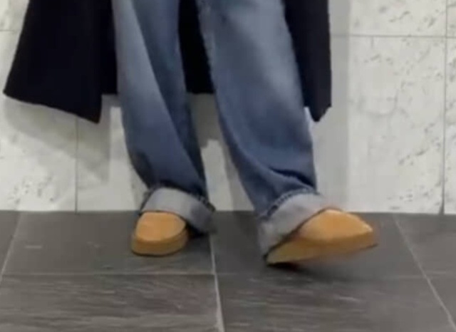 別のコーデでは、黒系パーカーのインナーに、ベージュの丈長めのセーターを着ることで下から色を出す着こなしを披露。マックスマーラのボリュームがあるキャメルカラーのケープを羽織ったら、あたたかな冬らしいコーデに。足元もブラウン系でまとめています。