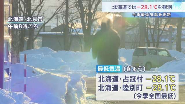 強い寒気の影響で北海道の占冠村と陸別町とでは、きょう、マイナス28.1℃を観測し、今シーズンの全国最低気温を更新しました。