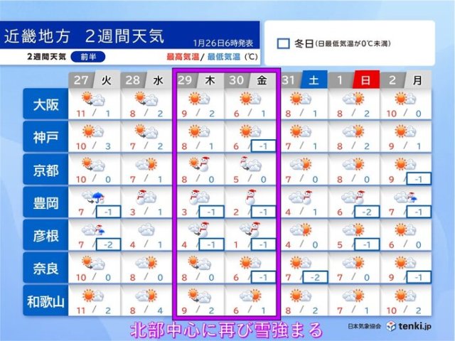 今日26日の近畿地方は大雪のピークは越え、雪が弱まってくる見込みです。長く続いた強い寒波の影響は、いったん落ち着くでしょう。ただ、29日(木)〜30日(金)ごろは再び雪の範囲が広がり、北部を中心に雪が強まる見通しです。また、厳しい寒さは少なくとも1月末にかけて続くでしょう。引き続き、雪や寒さに注意が必要です。