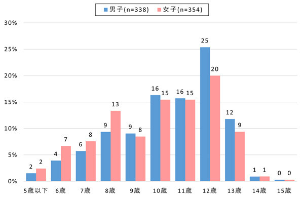 スマートフォンを所有している子どもを対象に、いつから所有しているかを調べたところ、男女ともに最も多いのは12歳だった。所有開始年齢は年々低下し平均では、男子が10.4歳、女子が9.9歳(全体では10.2歳)となり、調査開始以降初めて女子の平均所有開始年齢が10歳を下回った。