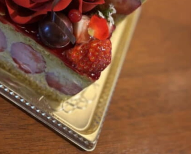 写真には、繊細な深紅の花びらが幾重にも重なるバラをあしらったイチゴのケーキが写っています。本物のバラが乗っているのかとつい見入ってしまいますが、驚くべきことに花はチョコレートで作っているとのこと。今まさに花びらが開いたばかりのみずみずしい質感まで見事に再現しています。