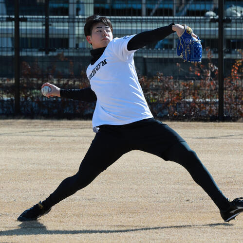 29日、兵庫・尼崎市の2軍施設SGLの室内練習場でブルペン入り。今年初めて捕手を座らせ、1球1球の感触を確かめながら約20球、5割程度の力感で直球のみを投じた。「感覚を確かめるという感じでフル出力でもない。『めちゃくちゃいい』とかはないですけど、いい感じだと思います」。1月に立ち投げをクリアするなど、明るい表情が順調なステップアップを物語る。