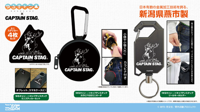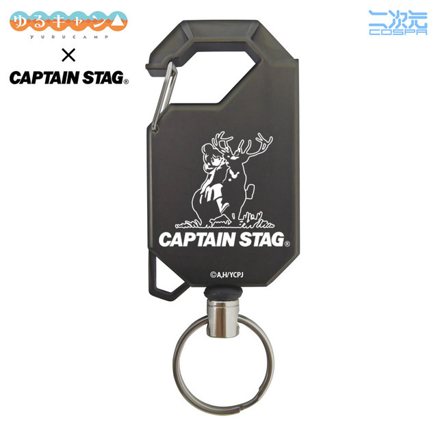 TVアニメ『ゆるキャン△ SEASON3』より、志摩リンがアウトドア総合ブランド「キャプテンスタッグ」のロゴになっている“牡鹿”にまたがる特別デザイングッズの新作が登場。新たに「リールキーホルダー」などを展開する。