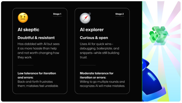 まずAIへの向き合い方として、ほとんどの開発者は「懐疑論者」(AI Skeptic)から始まり、試行錯誤を経ながらから「探索者」(AI Explorer)、「協働者」(AI Collaborator)、そして「戦略家」(AI Strategist)へと成熟していく過程があるという。